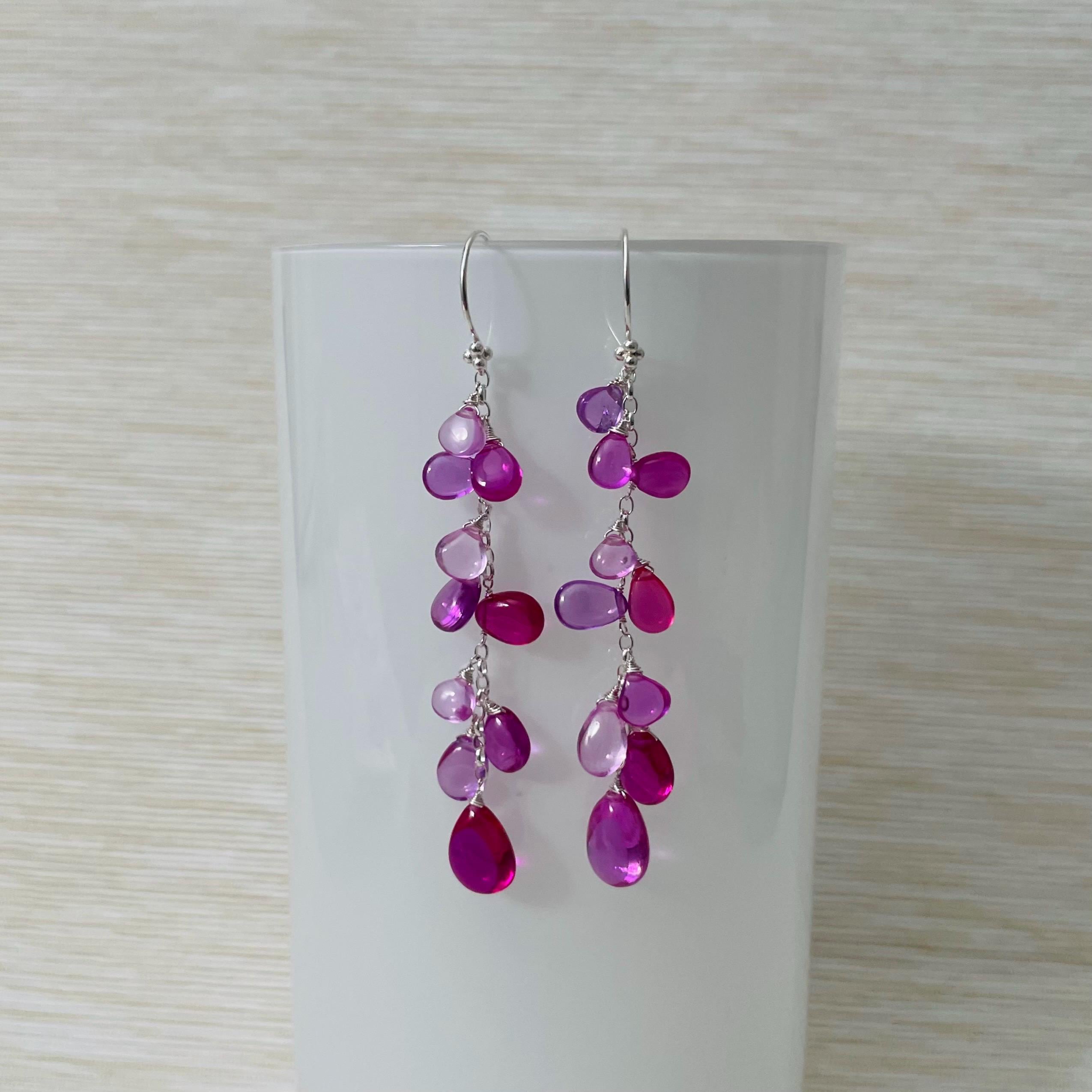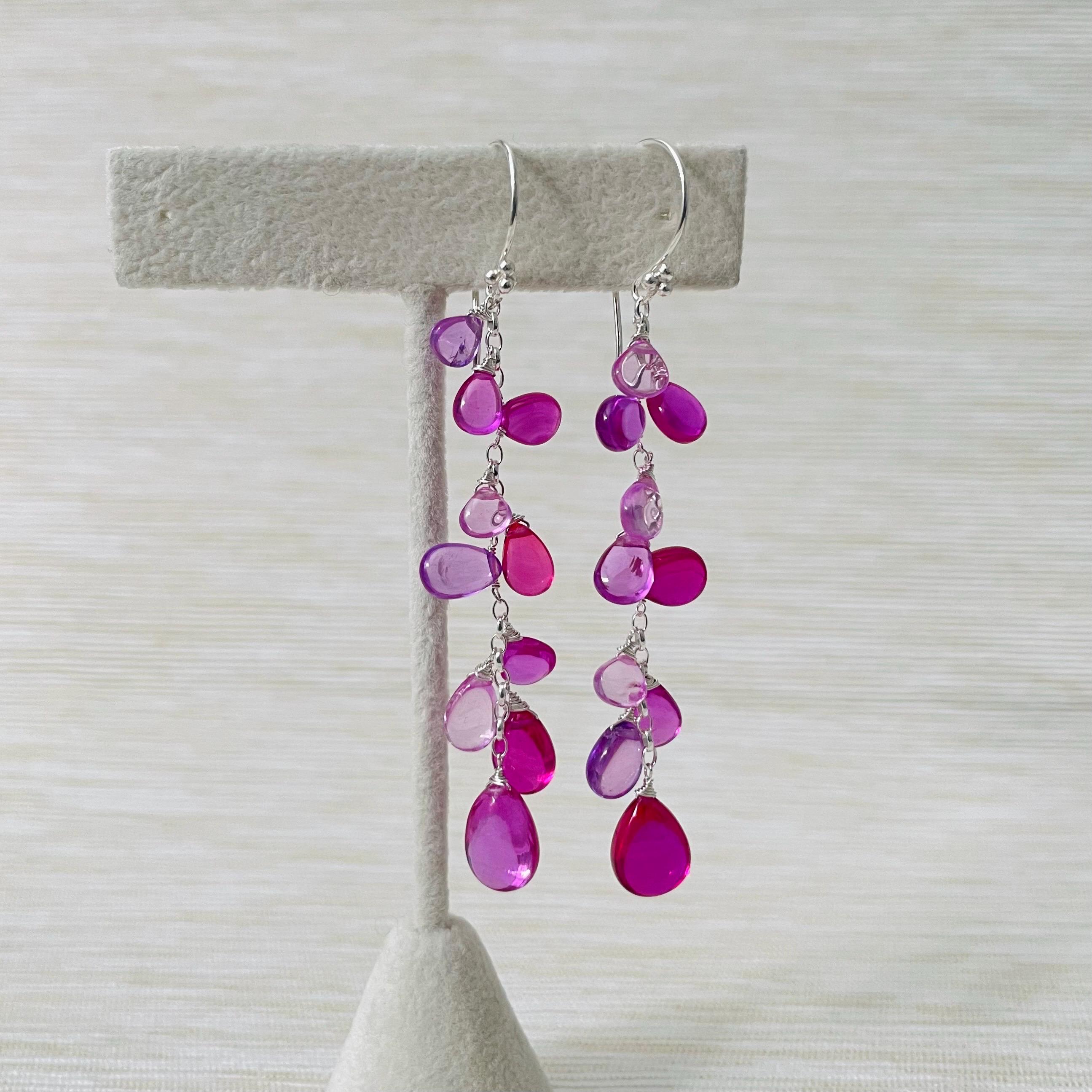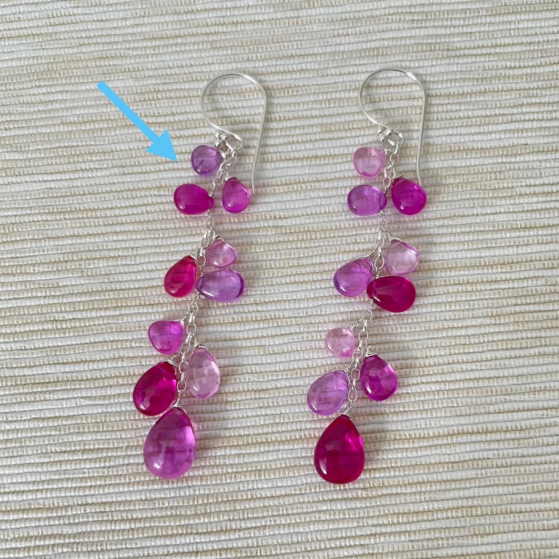 This set of gemstone is nearly perfect in color and clarity. Only one gemstone at the top has an occlusion. Because of the rarity of magenta sapphires, I included this in these earrings. (See the last image for details.)