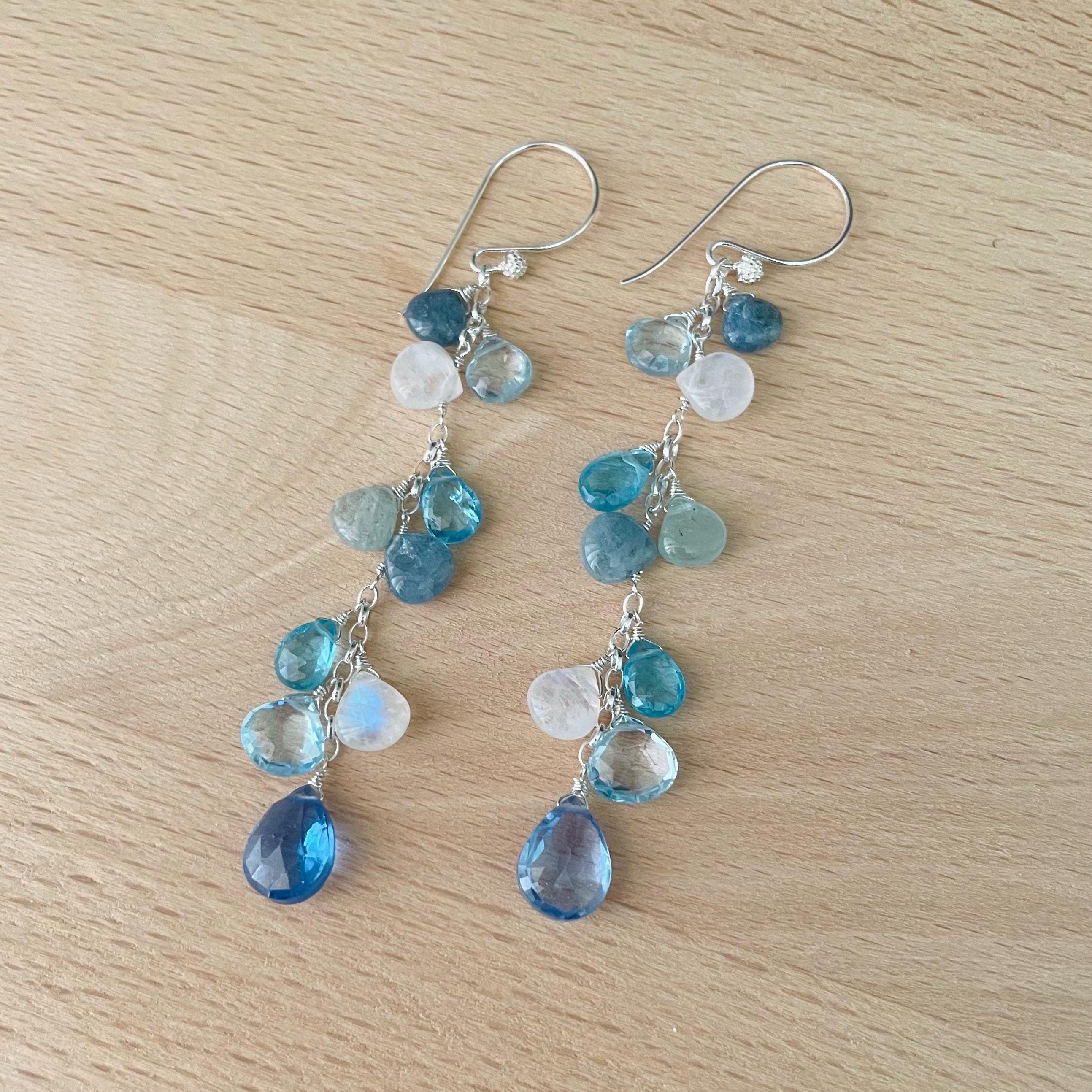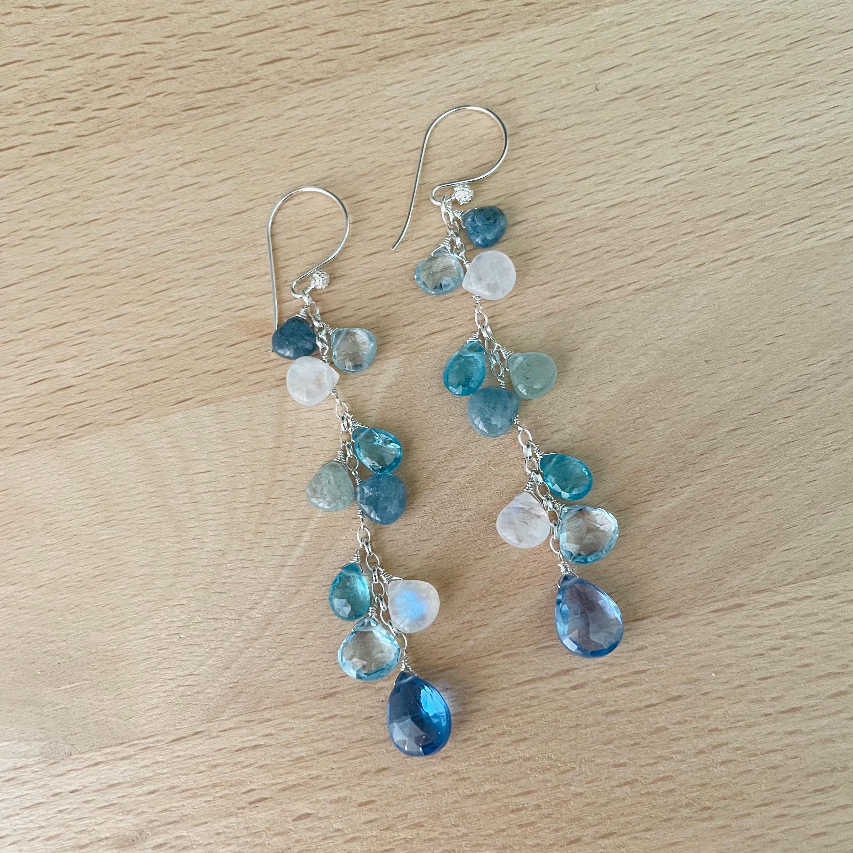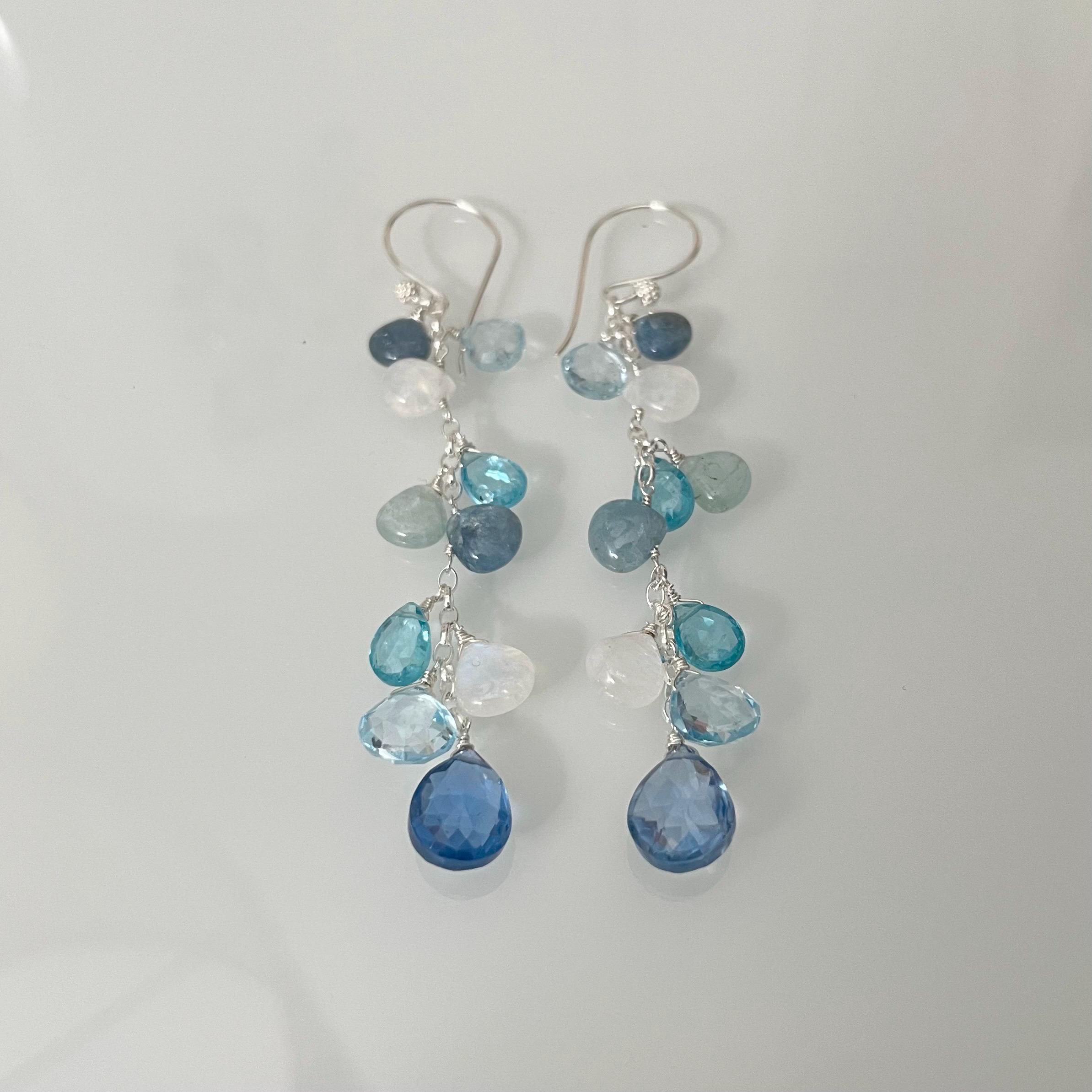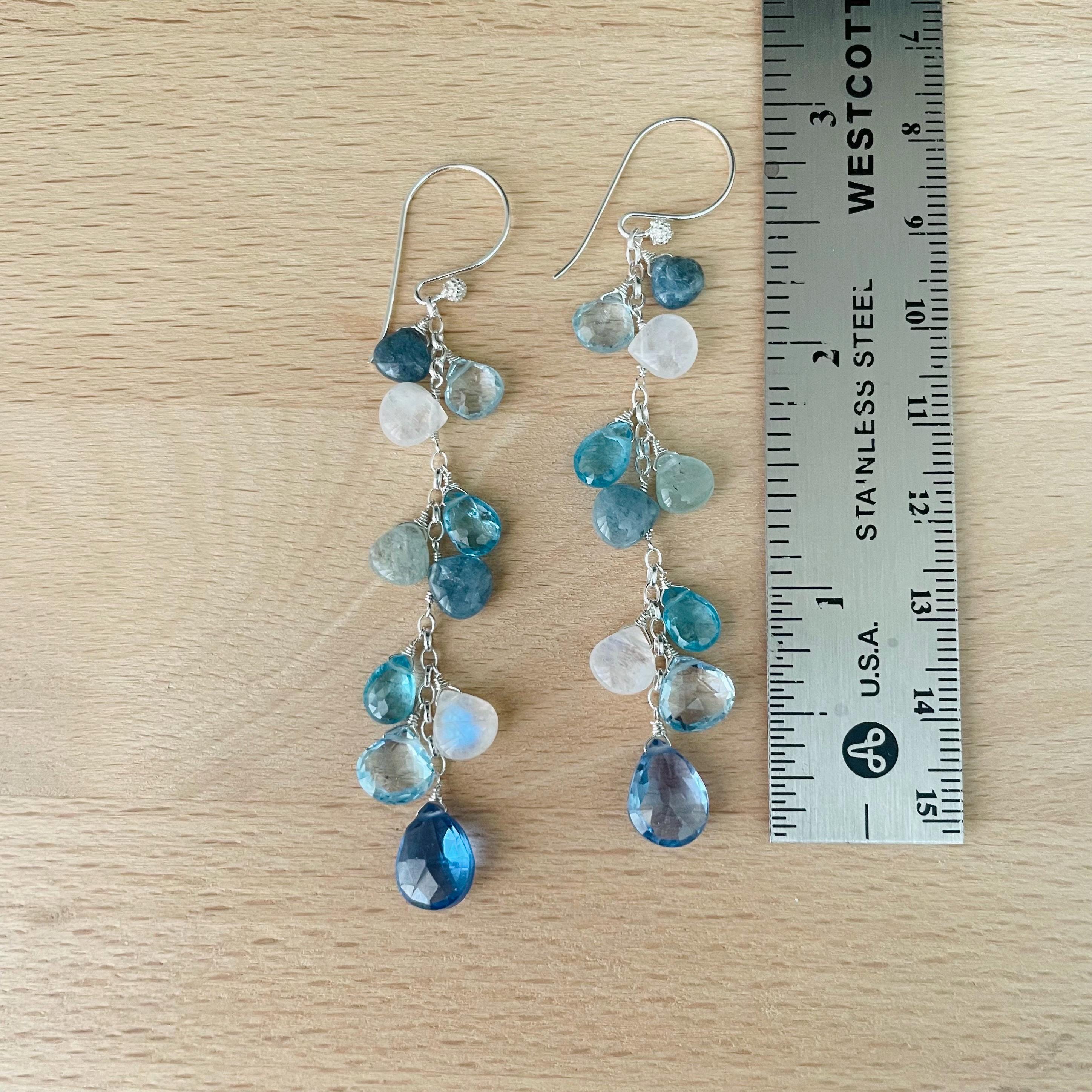 These earrings carry an aqua blue theme and reminds me of a glacier in spring. This collection of gemstones include Aquamarine, Sky Blue Topaz, Rainbow Moonstone and Apatite. These gemstones have excellent faceting/polish and clarity. This is a gorgeous suite of high quality gemstone briolettes. The focal aquamarines have different saturation which makes it unique. These gemstones measures approximately 11 mm long by 8 mm across. Other briolettes range from 6 mm to 8 mm long or wide.
