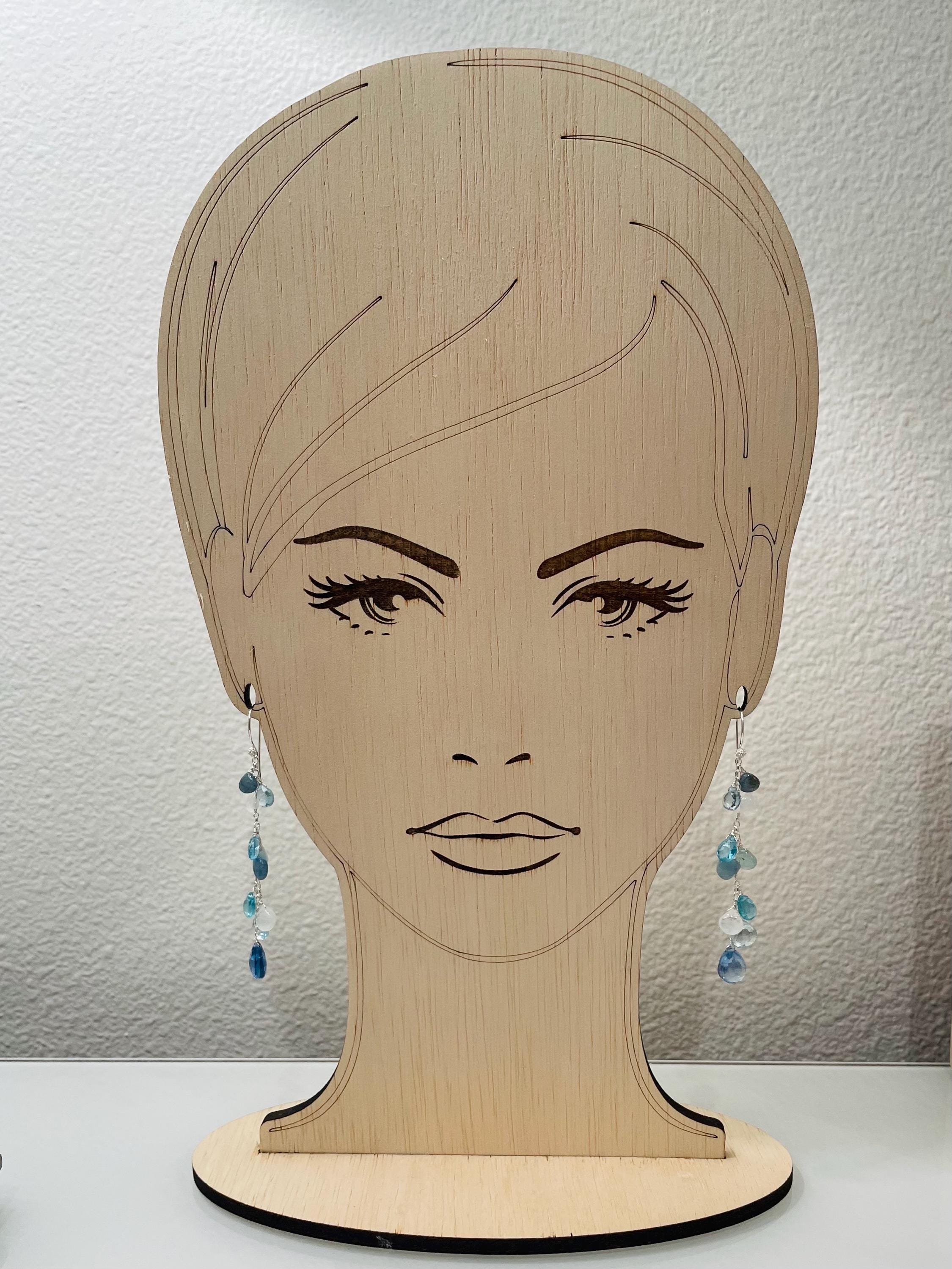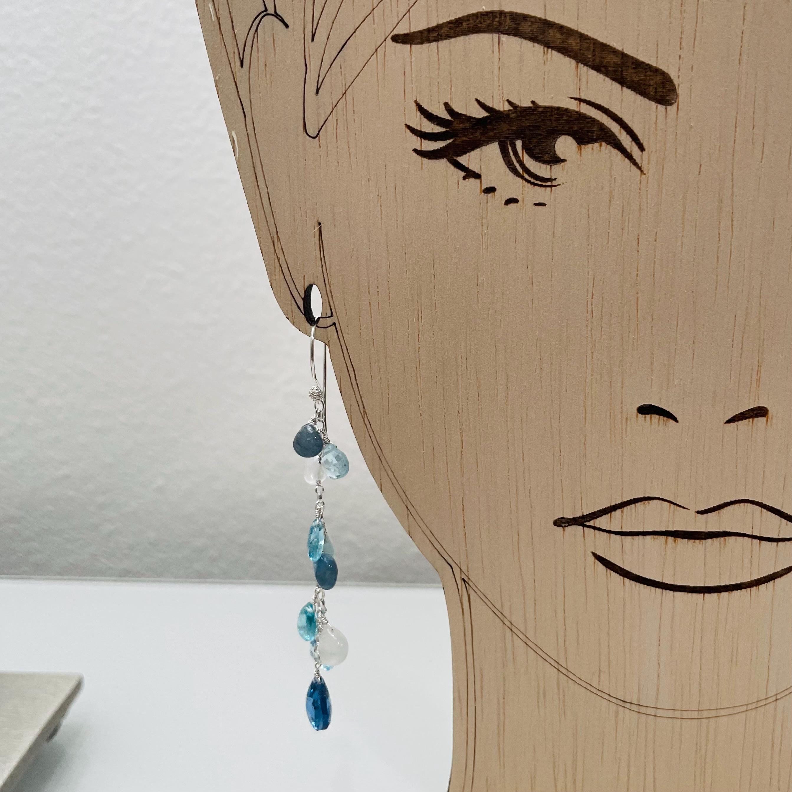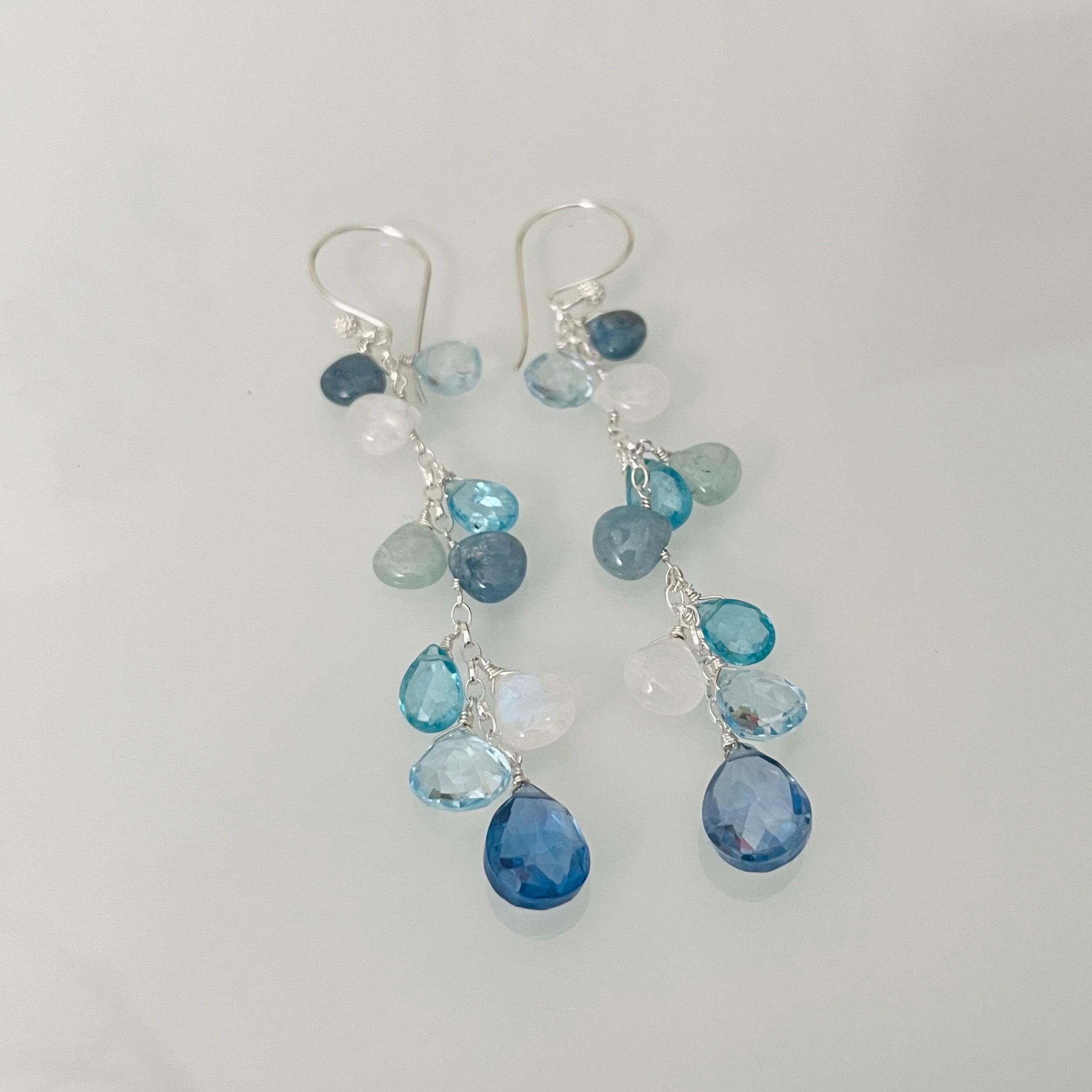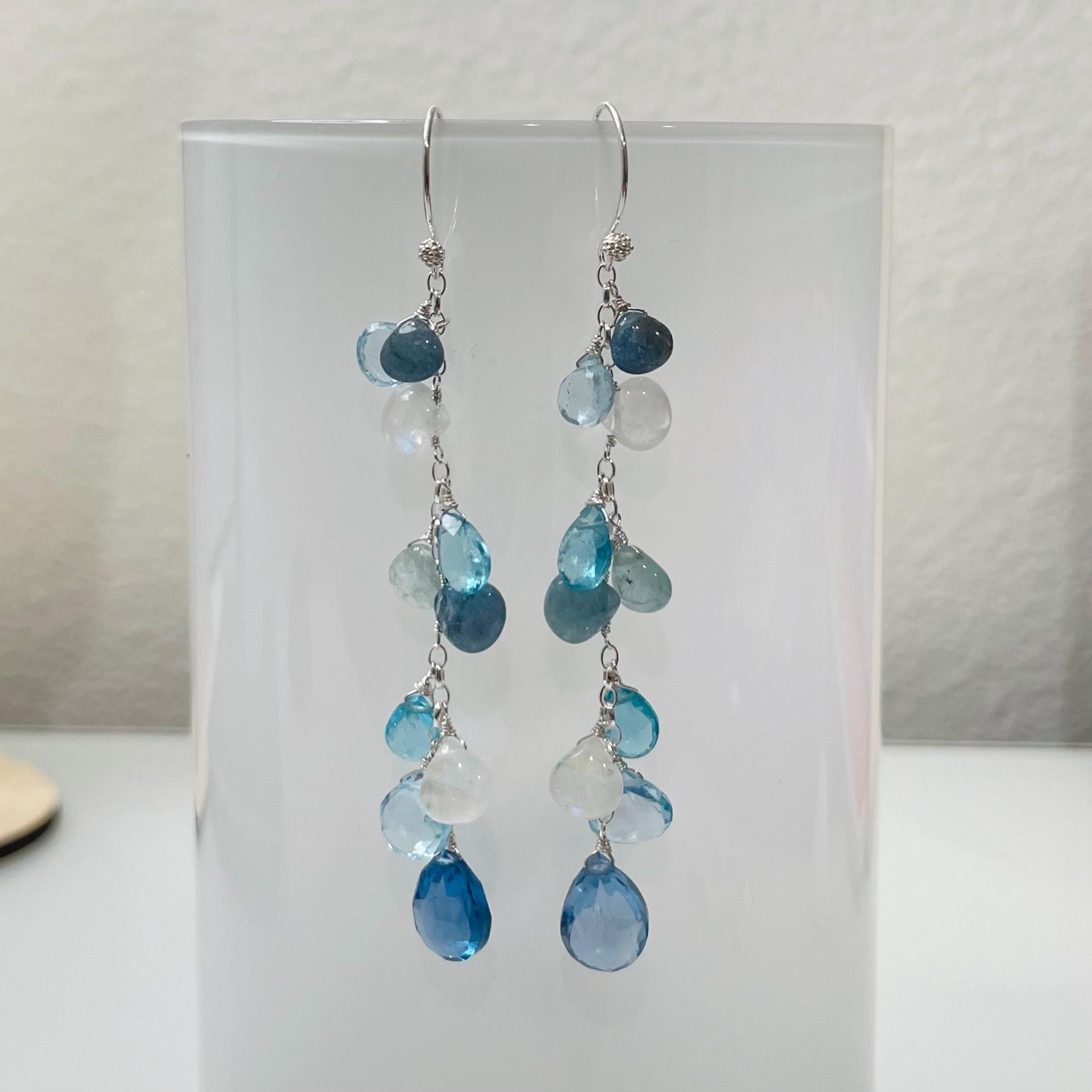 These earrings carry an aqua blue theme and reminds me of a glacier in spring. This collection of gemstones include Aquamarine, Sky Blue Topaz, Rainbow Moonstone and Apatite. These gemstones have excellent faceting/polish and clarity. This is a gorgeous suite of high quality gemstone briolettes. The focal aquamarines have different saturation which makes it unique. These gemstones measures approximately 11 mm long by 8 mm across. Other briolettes range from 6 mm to 8 mm long or wide.