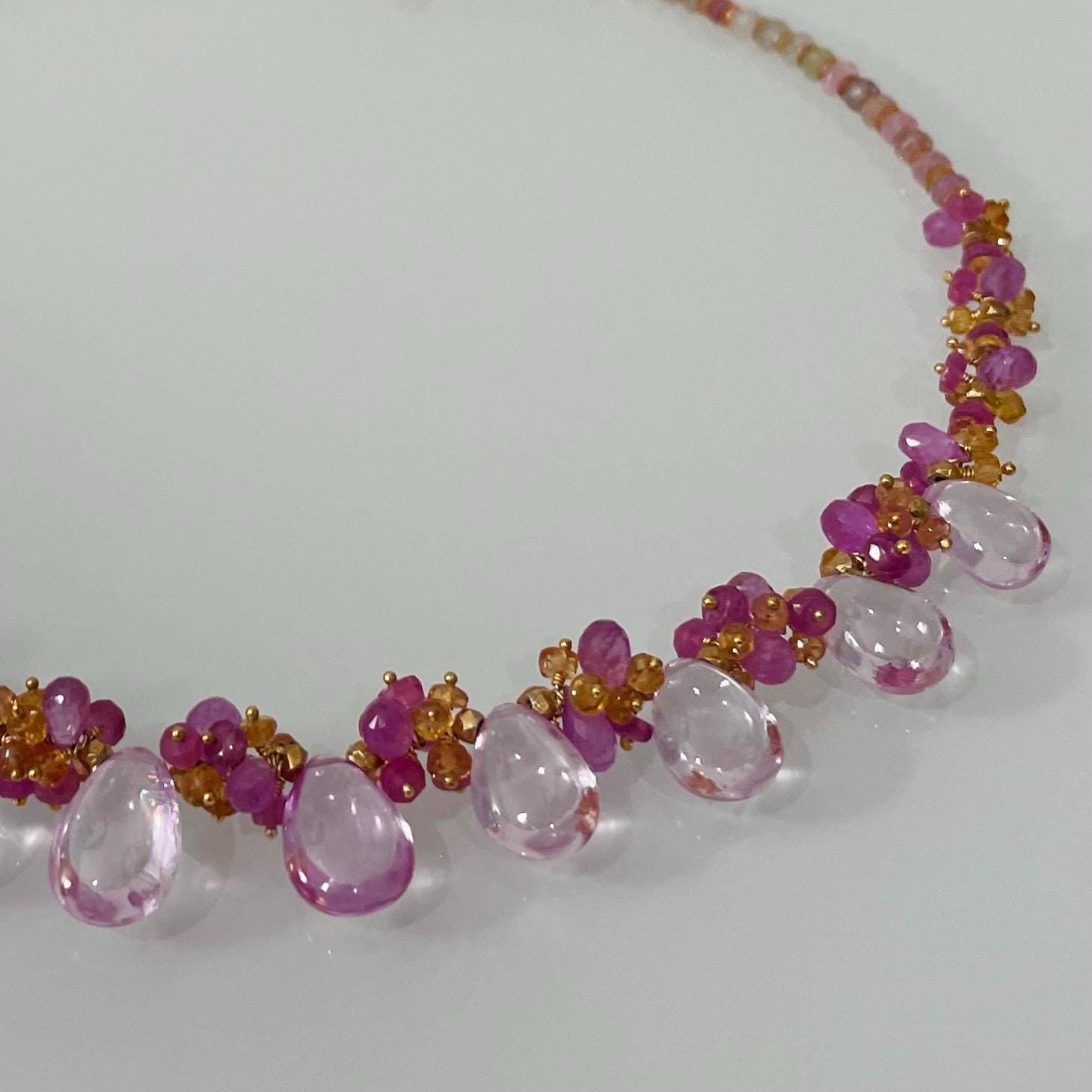 This fabulously gorgeous sapphire necklace earrings set is composed of natural sapphire gemstones. (Gemstones are most likely heat treated per vendor.) The focal gems are comprised of light pink sapphires, reminiscent of spring cherry blossoms. Hence, the name Sakura. Beautiful fuschia pink teardrop briolettes and rondelles accent this necklace. Tiny but bright orange padparadscha sapphires are added for color and contrast. The smooth polished sapphire briolettes measure approximately 11 to 13 mm in length and 8 to 10 mm in width. There is a total of 15 smooth polished light pink sapphire briolettes in graduating sizes. This is an all sapphire piece and thus, carry a noticeable weight. I would have set this piece in genuine 14K gold if the price of gold did not skyrocket. This is how gorgeous these gems are.